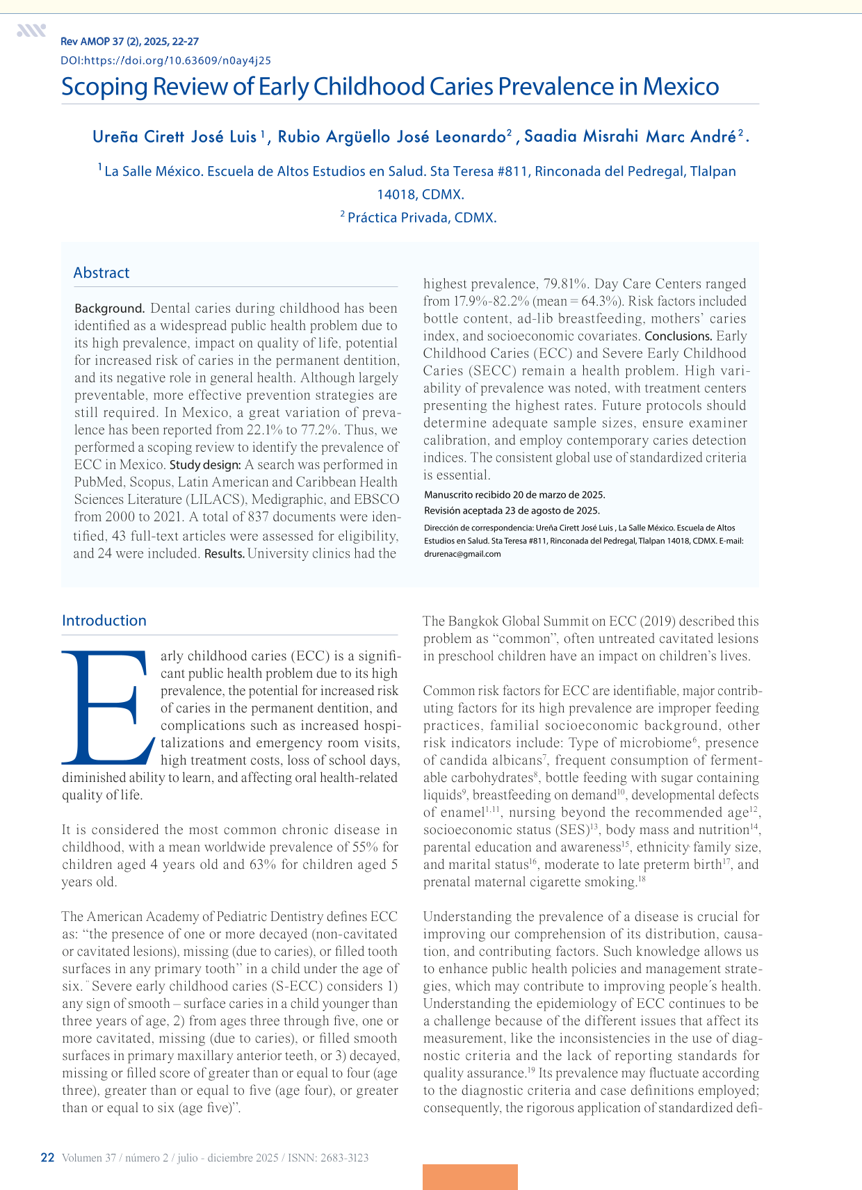 Background. Dental caries during childhood has been identified as a widespread public health problem due to its high prevalence, impact on quality of life, potential for increased risk of caries in the permanent dentition, and its negative role in general health. Although largely preventable, more effective prevention strategies are still required. In Mexico, a great variation of prevalence has been reported from 22.1% to 77.2%. Thus, we performed a scoping review to identify the prevalence of ECC in Mexico.